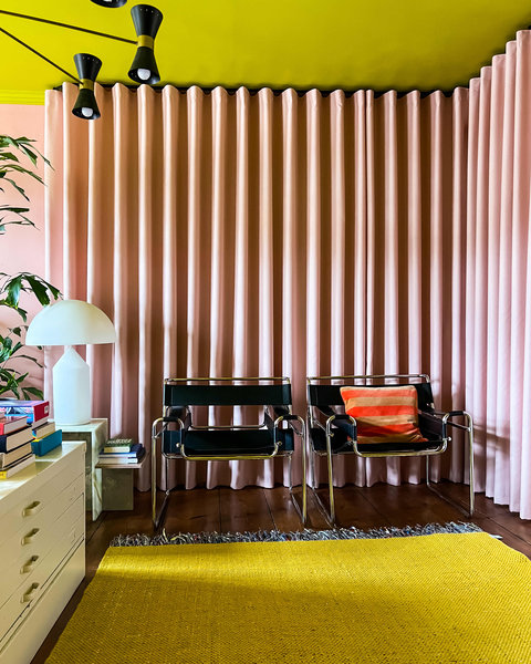 @Joe Munoz holt sich nach und nach mehr Farbakzente nach Hause. Nach dem selbst gemalten Blumenstillleben im letzten Monat wurde nun die Wand dahinter in ein Mid-Century-Altrosa gehüllt. Der gleichmäßig in Falten gelegte Vorhang im Arbeitszimmer von @HerrKLAR wird zur skulpturalen Installation, während er eigentlich dahinter reichlich Stauraum bietet.