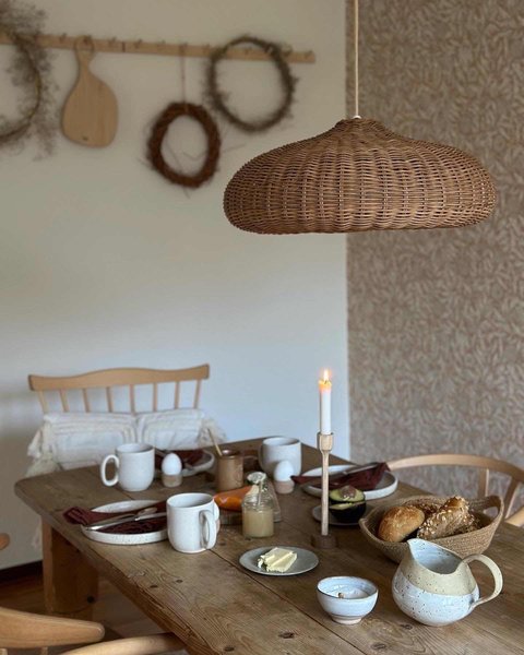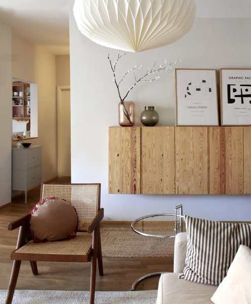 Bei @Schoene_kleine_welt trifft ein massiver Holztisch auf eine filigrane Rattanleuchte und natürliche Kränze als Wanddeko, bei @imma galiana ein Loungesessel mit Wiener Geflecht auf IKEAs IVAR.