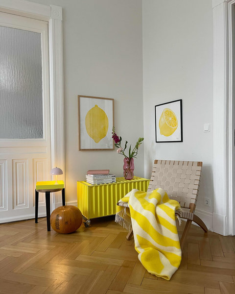 Bis vor Kurzem war Gelb überhaupt nicht die Farbe von @PippiLottaausHamburg : Seit MAGAZINs Container DS bei ihr eingezogen ist, durften immer mehr Gelbnuancen das Eck ihrer Wohnung füllen. Jüngst hinzugekommen sind die Lemonprints von Monika Petersen. Zitronen ziert auch das Poster im Esszimmer von @katiberg .