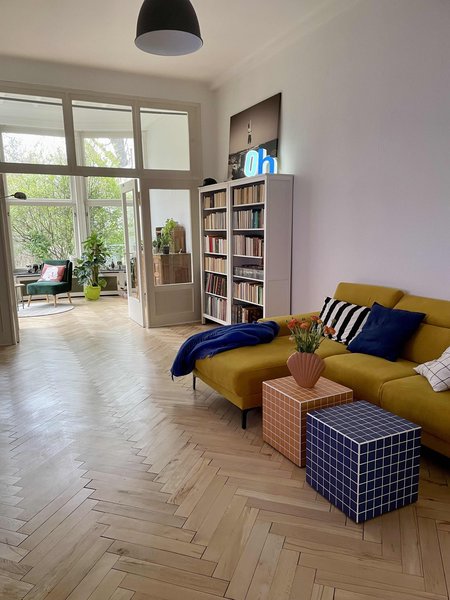 Die warmgelbe Tischleuchte auf dem Betthaupt wird zum Blickfang im neu gestalteten Schlafzimmer von @Interioroverdose . Im Wohnzimmer von @zweiter.Stock_links matchen die beiden Fliesentische mit Sofa und textilen Accessoires.