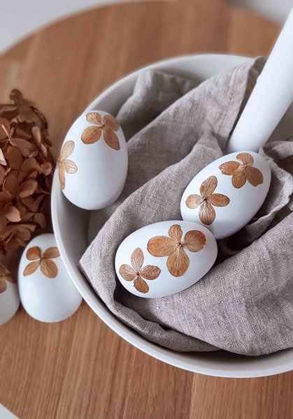Zwei hübsche DIY-Ideen zu Ostern: @Homestylepassion hat mit einem schwarzen Stift ein Häschengesicht auf einen Anzuchtbecher gezeichnet und eine aufgerollte Serviette als Ohren hineingesteckt. @Zauberhaftes_Zuhause hat mit etwas flüssigem Bastelkleber getrocknete und gepresste Hortensienblüten in Form eines vierblättrigen Kleeblattes auf einem Ei befestigt – das kann nur glücklich machen!