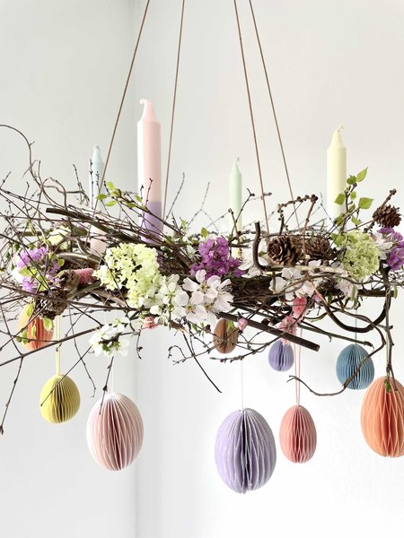 Ostereier aus Papier: Während @wohnliebe_4 ihren hängenden Osterkranz mit farbenfrohen Papiereiern, Frühlingsblumen und Kerzen dekoriert, setzt @kosmea auf einen minimalistischen Osterstrauch in einer Vintage-Vase mit Eiern in Zartrosa.
