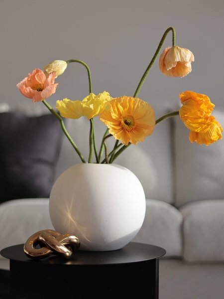 Wie herrlich fotogen gelbe und lachsfarbene Mohnblumen sind, beweist uns @Splitlevel.home mit ihrem hübschen kleinen Arrangement. Die kugelförmige Vase hat sie bei Cooee gefunden. @key sorgt mit frühlingshaften Zweigen in einer hohen organisch geformten Vase und einer flackernden Kerze für Gemütlichkeit.