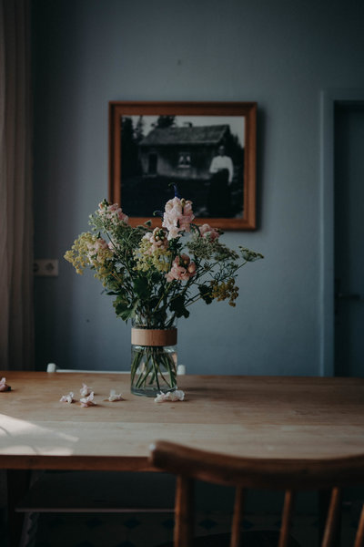 Charmante Vintage-Vibes prägen die Küche von @marcia , die durch das Blumenbouquet in sanften Farben perfekt ergänzt werden. Ebenso liebevoll wie ihr Zuhause gestaltet @Katuescha auch ihre Blumenarrangements. Die Kombination aus Blau-, Rosa- und Fliedertönen harmoniert besonders gut mit ihrer Glasvase.