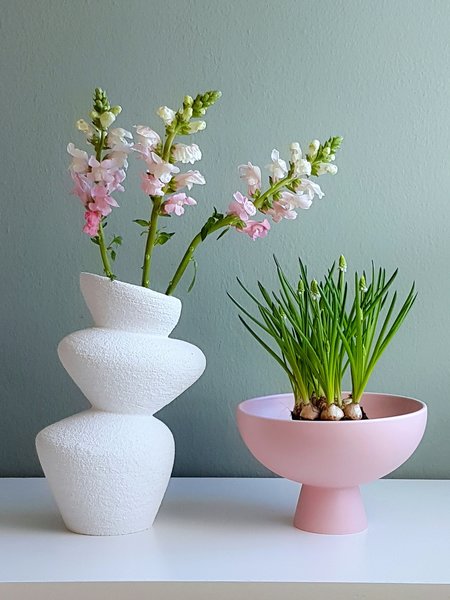 „Ein bisschen Farbe macht doch gleich gute Laune!“, findet @filomena und kombiniert zarte Levkojen in der strukturierten, wie gestapelt wirkenden Vase mit noch nicht ganz erwachten Frühlingsblumen in der raawii-Schale. @ernebart kauft ihre Vasen am liebsten secondhand auf eBay, konnte an diesem hübschen Stück im Knotendesign von Rosenthal aber nicht vorbeigehen. Verstehen wir nur allzu gut!