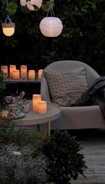 Die neue LED-Lichterkette SOLVINDEN sorgt für lauschige Stimmung in warmen Frühlingsnächten. Sie ist auch im Lampiondesign erhältlich und verwandelt so, gepaart mit den neuen NORRMANSÖ-Stühlen, die heimische Terrasse in ein hübsches kleines Café.