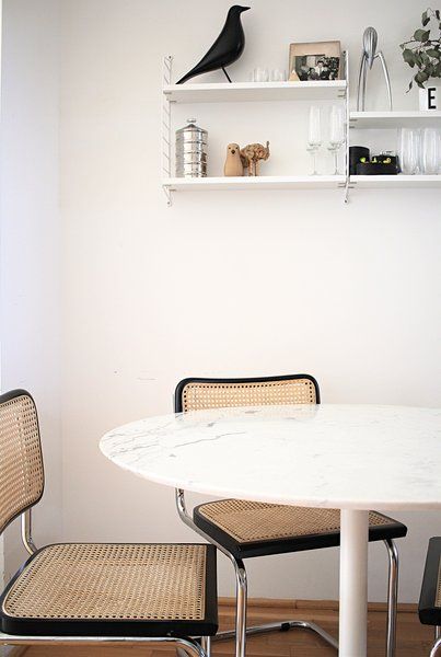 Für mich persönlich ist der Tisch ein absoluter Alleskönner. Ich kombiniere immer mal andere Stühle drumherum und alles fügt sich meiner Meinung nach immer sehr harmonisch zusammen. Ich habe Stühle aus Holz, Plastik und Chrom und Marmor passt irgendwie zu all diesen Materialien gut.
