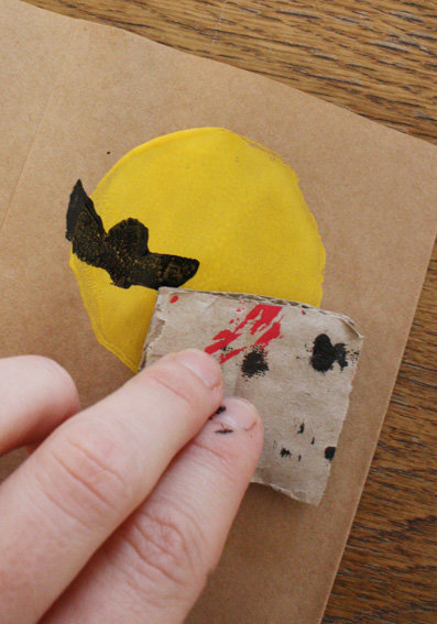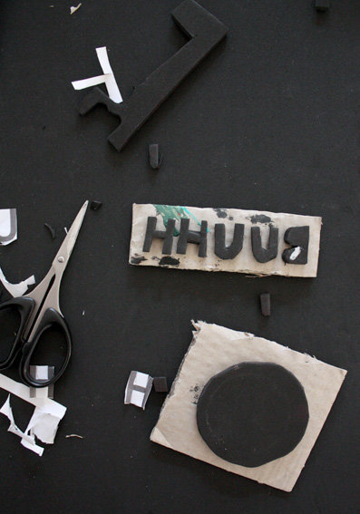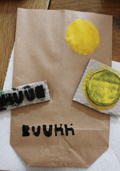 Die Buchstaben spiegelverkehrt auf die Wellpappe kleben. Zum Schluss eine kleine Fledermaus ausschneiden und ebenfalls auf ein Stück Pappe kleben. Die Stempel kurz antrocknen lassen, damit sie sich beim Drucken nicht verschieben. Mit dem Pinsel Farbe auftragen und drauflosstempeln. Das ist kinderleicht und das Ergebnis ist schön anzuschauen. Weil’s so Spaß gemacht hat, habe ich gleich noch ein paar Briefumschläge und Briefpapier bedruckt.