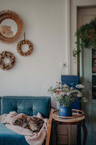 Ich bin Frauke (31) und wohne mit meinem Mann und meinem fünf Monate alten Sohn auf 75 qm in Köln. Unseren Wohnstil würde ich als zurückhaltend und natürlich beschreiben. Ich bin großer Fan von Wabi-Sabi und gebe alten geliebten Dingen sowie neuen Fundstücken gerne Raum.