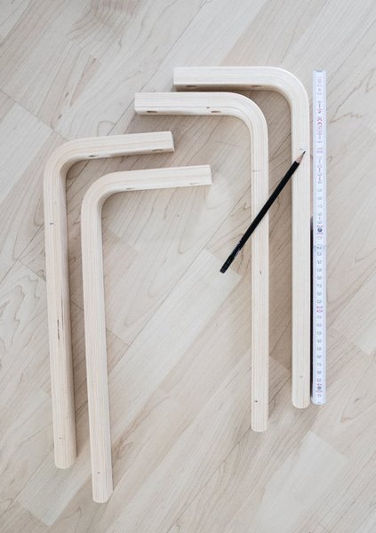 Jetzt müssen die ehemaligen Hockerbeine an die Leimholzbretter angeschraubt werden. Erst die Vorderseite und dann die Rückseite anbringen (auf einer Seite beide Hockerbeine mit dem Bogen oben und auf der anderen beide jeweils nach unten zeigend).