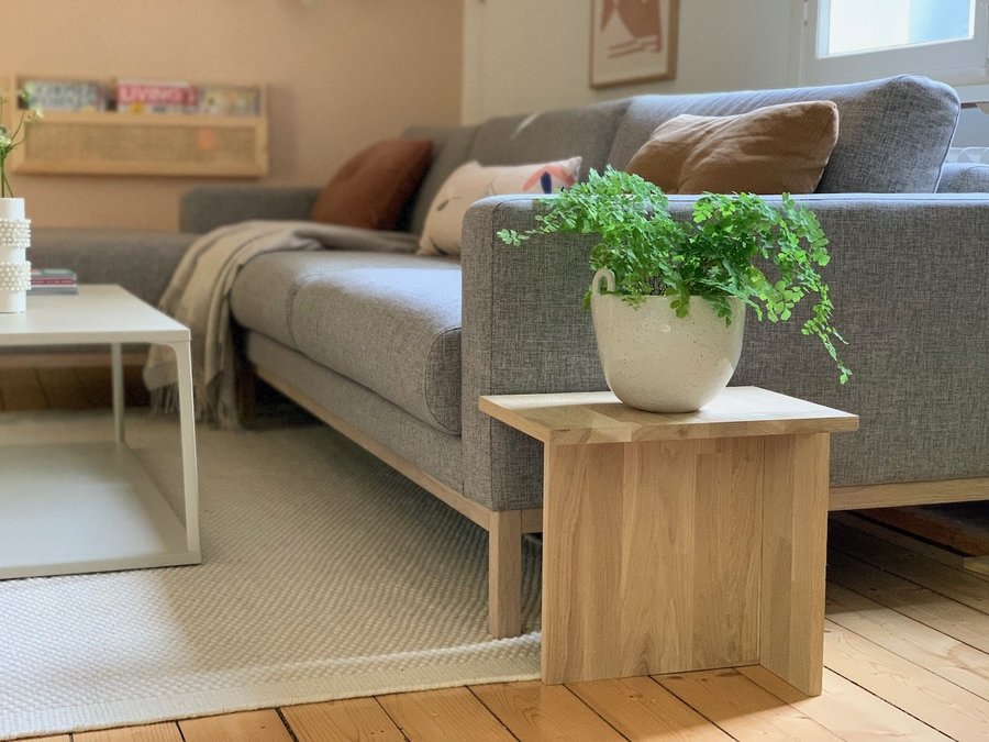 Als Pflanzenhocker verwendet, fügt sich der selbstgebaute Beistelltisch perfekt in Jessis gemütliches Wohnzimmer ein. Weitere DIY-Möbel aus Holz sollen folgen.