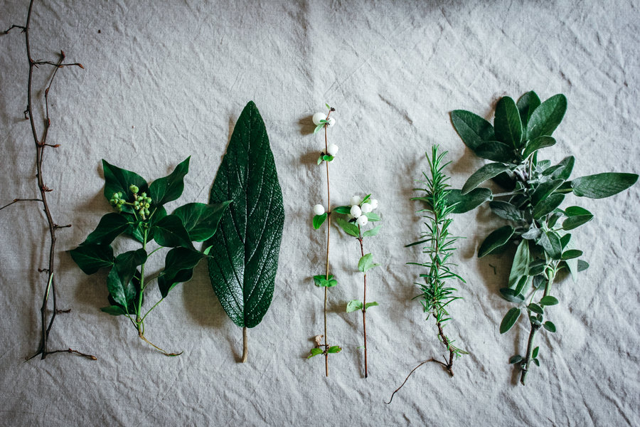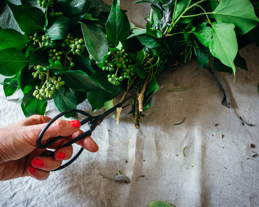 Für Evas Kranz eignet sich fast alles an Zweigen und Sträuchern, was man im Wald oder im eigenen Garten finden kann, zum Beispiel Salbei, Rosmarin und wilder Efeu. Alternativ können auch Trockenblumen oder selbst eingefärbte Blätter verwendet werden.