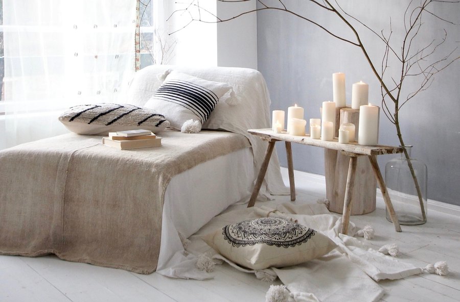 Minimalistischer Skandi-Chic: Die Kombination aus grauen Wänden zum weißen Fußboden, zu Kerzen und Naturmaterialien sorgt bei @boheme-living für ein reduziertes, aber behagliches Ambiente.