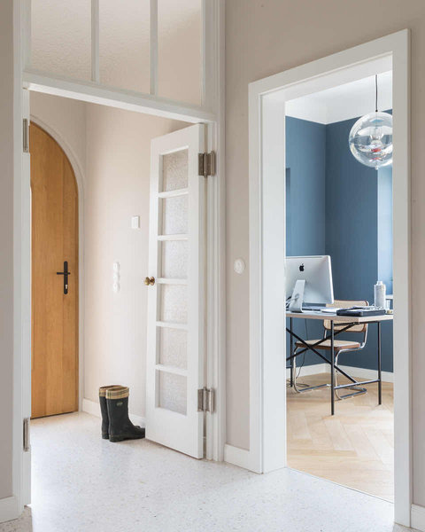 Hohe Decken, Pendeltüren und ein weißer Terrazzoboden: @kleinstadtklischee s Flur ist ein kleines Gesamtkunstwerk. [@waterloo]s weiß gehaltener Flur wirkt clean und aufgeräumt, bringt einzelne Accessoires wie Bilder und Pflanzen noch mehr zur Geltung.