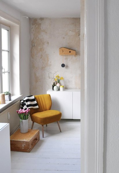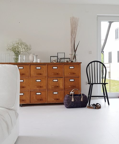 Bei @Lenkas_Kitchn trifft eine patinierte Wand auf einen weißen Dielenboden. Der Cocktailsessel von den Eltern und ein zum Beistelltisch umfunktionierter Holzkoffer unterstreichen den Vintage-Charme. @un.verleichtbarkeit s Werkzeugschrank ist ein Fundstück aus der Nachbarstadt, das durch den weißen Boden an Leichtigkeit gewinnt.