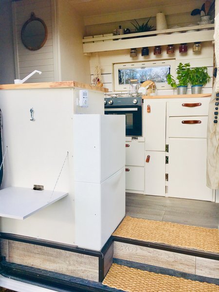 Ja, er ist ein VW Crafter (Baujahr 2013) und 7 m lang. Ich habe einen kleinen Wohnbereich mit Couch, die sich zum Bett ausziehen lässt. Dann habe ich ein separates WC und eine großzügige Küche. Ich habe beim Ausbau auf viele Details geachtet und mir ein gemütliches, aber funktionales Zuhause auf vier Rädern geschaffen.
