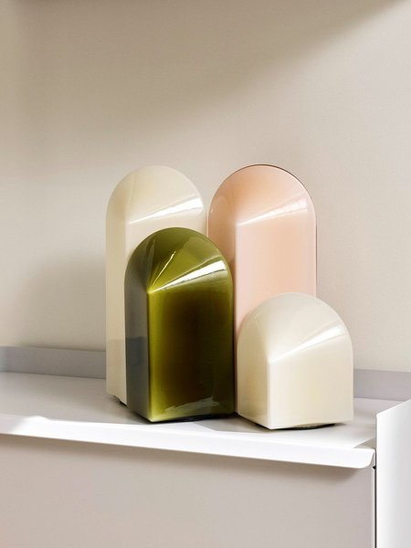 Skulpturale Lichtquellen aus Glas, die an- oder ausgeschaltet, einzeln oder gruppiert zum Blickfang in jedem Raum werden: Die Parade-Serie (ab 195 €) aus geometrischen Formen ist in drei Größen und in den Farben Shell White, Blush Pink sowie Moss Green erhältlich. Die LMB-Leuchte (165 €) ist aus gefalteten vertikalen Stahlblechen gefertigt, um ein poetisches Wechselspiel von Licht und Farbe zu schaffen. Sie ist in fünf Farben erhältlich.