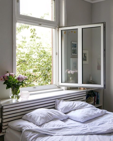 @danusia s selbst gebautes Betthaupt besteht aus unbehandeltem Kiefernholz und hat nicht nur ihre vorher leicht schiefe Wand begradigt, sondern ihr auch süße Träume bei sanftem Holzduft beschert. Betthaupt und Regal zugleich: @2box detail s selbst gebaute Holzkonstruktion unter dem Fenster bietet Stauraum für Bücher und Deko.