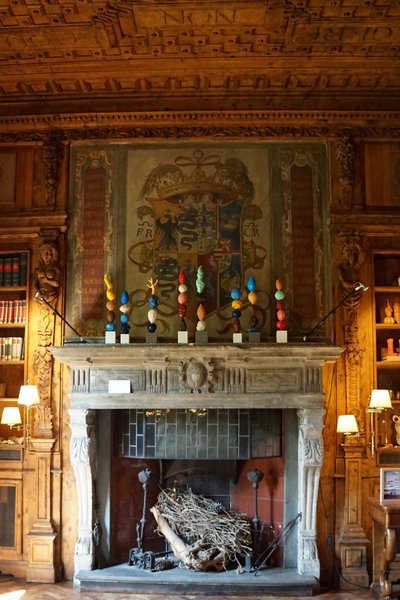 Filigrane Blumen, in Vasen von Felicity Aylieff, bringen Leichtigkeit in den reich verzierten holzvertäfelten Raum.