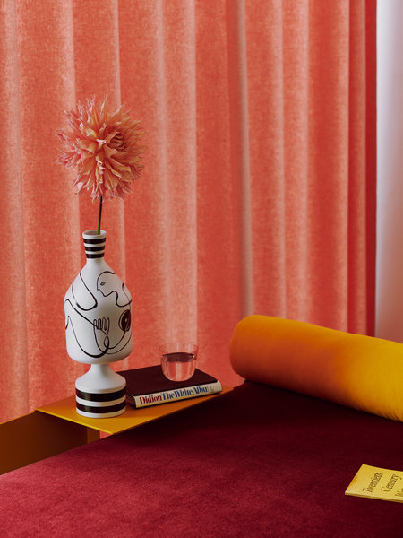 Ein Gänsehautmoment: Das Innen wird um das Außen erweitert, indem es die Farben des Gebäudes in Millennial Pink von Duggan Morris aufnimmt.
