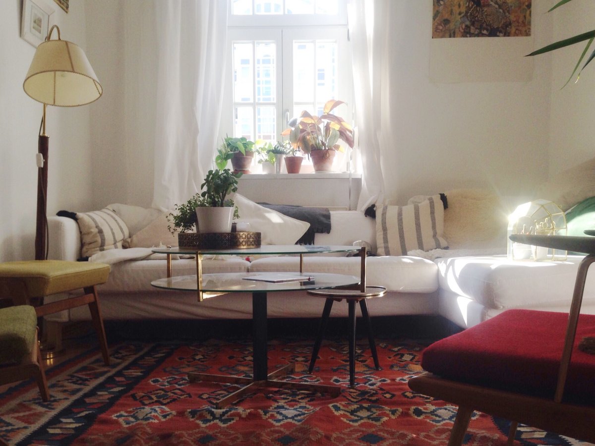 Ich habe sechs Jahre lang in einer Wohngemeinschaft gelebt, bin aber seit einem Jahr alleine in meiner gemütlichen zwei Zimmer Altbau Wohnung und damit jetzt auch sehr glücklich. Ganze 65 Quadratmeter kann ich endlich ganz in meinem eigenen Stil einrichten! Mein Schlafzimmer mit selbst gebautem Bett ist sehr einfach gehalten. Im Wohnzimmer gesellen sich ein paar Midcentury Möbel, die mir meine Eltern geschenkt haben, zu einem großen DIY-Regal, dass ich für meinen Plattenspieler und meine Schallplatten gebaut habe. Ich liebe es, Möbel selber zu bauen; auch mein Küchenregal ist eine Eigenkonstruktion. Außerdem dekoriere ich gerne immer wieder neu und liebe schöne Fotos und Postkarten. Wichtig und deshalb in der ganzen Wohnung zu finden sind für mich auch Zimmerpflanzen .