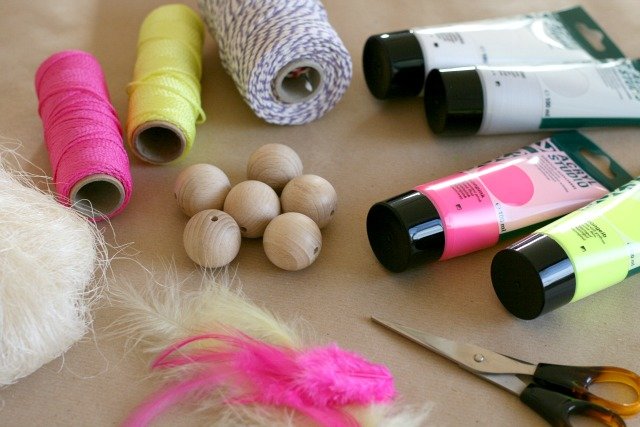 Die Holzkugeln nach Belieben mit Neonfarben bemalen und dann zur Kette auffädeln. Wenn man möchte kann man auch noch Federn an den Bändern befestigen. Die Kette dann zum Kreis verbinden und im Inneren mit ein wenig Deko-Sisal ausfüllen... Violà ein neuer, gestylter Becher für das Frühstücksei...
