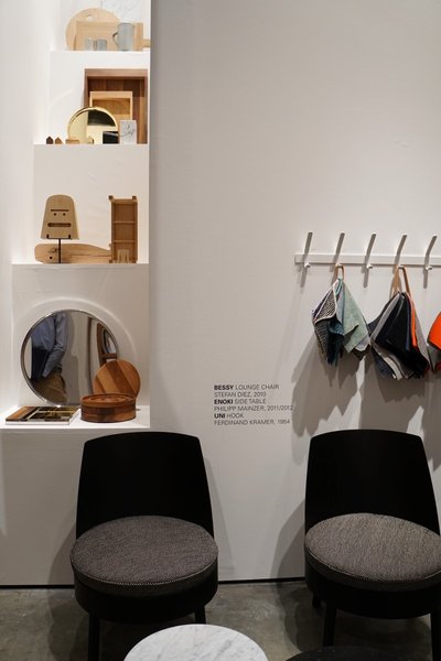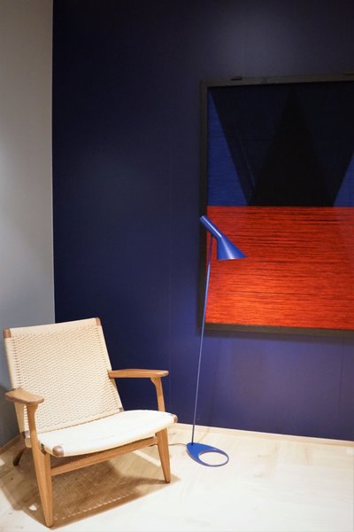 Bei Carl Hansen: der wunderschöne CH25 Lounge Chair von 1950, entworfen von Hans J. Wegner, daneben die blaue AJ-Stehleuchte. Ein Mobile ähnlich der Futura von Flensted.
