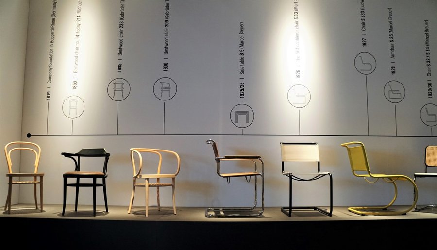 Thonet zeigte neben Neuheiten auch seine von uns heißgeliebten Klassiker (von links nach rechts): der Kaffeehausstuhl 214, Stuhl 233 mit Ledersitz, der sehr schöne 209, Mart Stams S 34 mit Armlehnen; die All Seasons Stühle: S 33 N und der gelbe S 533 N von Ludwig Mies van der Rohe, ganz außen: der Geflechtstuhl S32 von Marcel Breuer.