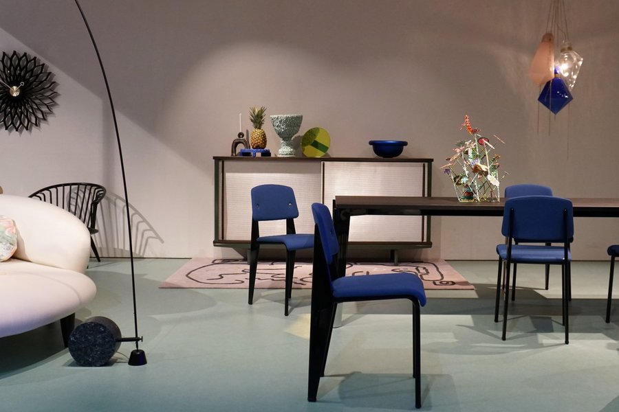 Vitra hatte sich dieses Jahr für ausgefallene Rauminstallationen entschieden: hier zu sehen der Jean-Prouvé-Stuhl Standard SR mit blauem Bezug, der minimalistische Esstisch Flavigny von Prouvé und die George-Nelson-Wanduhr Sunflower. Der Standard-Stuhl steht schon lange auf meiner Wunschliste.