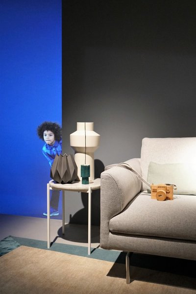 Ich bin großer Fan vom modularen Sofa Kerman von e15: Es kann so unterschiedlich aussehen und die Module können variabel gestaltet werden – und es passt einfach auch in nicht so große Wohnzimmer. Die blaue Stoffpflanze von Wandschappen war schon auf der imm cologne im Januar der Hingucker und ist auch in Mailand Teil des Petite-Friture-Messestandes.