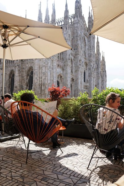 Hängen lassen, entspannen, ausruhen: Die Hersteller erleichtern uns das Zur-Ruhe-kommen. Dankeschön dafür: Morosos Daybed Tropicalia und der Acapulco Chair auf der Campari-Terrasse mit Blick auf den Mailänder Dom. Ein netter kleiner Touri-Ausflug-Moment für Daniel und mich während des Metro-Streiks – und dann der Ausblick dazu ...