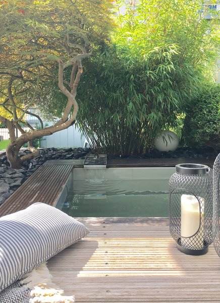 Wo sich heute das Wasserbecken von @Katja R. befindet, war zuvor ein kleiner Fischteich. Während ihr Sohn auf der Terrasse für das Abitur lernte, saß er aufgrund der Hitze plötzlich im Teich. Da kam Katja der Gedanke, ein Wasserbecken zu errichten, in dem man sich erfrischen könnte. Ein Metallbauer setzte das Becken ein. Mit einer kleinen Teichpumpe betrieben und mit ein bisschen Geschick konnte so ein kleiner „Wellnessbereich“ zu einem moderaten Preis gebaut werden. Die richtige Beleuchtung schafft übrigens noch eine tolle Atmosphäre in lauen Sommernächten. Mehr zu Katjas Wasserbecken erfahrt ihr in ihrer Gartenstory.