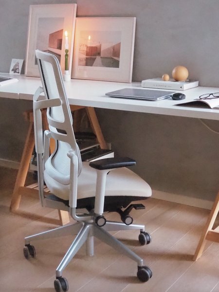 Früher hat Dennis am Küchentisch und auf einem Vintage-Freischwinger gearbeitet. „Gerade wenn man viel am Schreibtisch sitzt, ist ein an den Körper anpassbarer Stuhl unverzichtbar“, erklärt er. „Auf dem Gesture-Stuhl lässt es sich auch über Stunden hinweg bequem arbeiten – meine Rückenschmerzen sind Geschichte!“