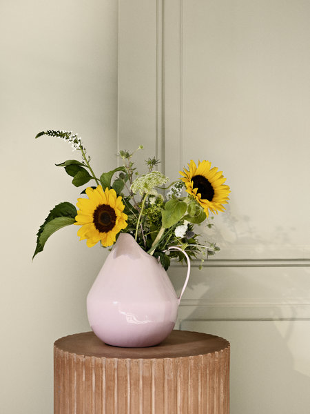 Hübsche Multitalente von Broste Copenhagen: Die Rosario-Vasen aus emailliertem Eisen können klassisch als Vasen, aber auch als Gießkannen verwendet werden. Ihre Farbtöne, Fairy Pink und Jelly Green, lesen sich wie ein Sommermärchen.