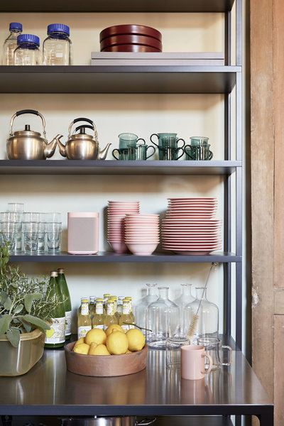 Inspiration von HAY: Das dänische Label zeigt, wie aufgeräumt und dekorativ ein Vorratsraum aussehen kann. Schlaue Idee: Neben Regalen für Geschirr und für Vorräte auch ein Spülbecken integrieren, so lässt sich Abspülen und Aufräumen gleich in einem Schritt erledigen!