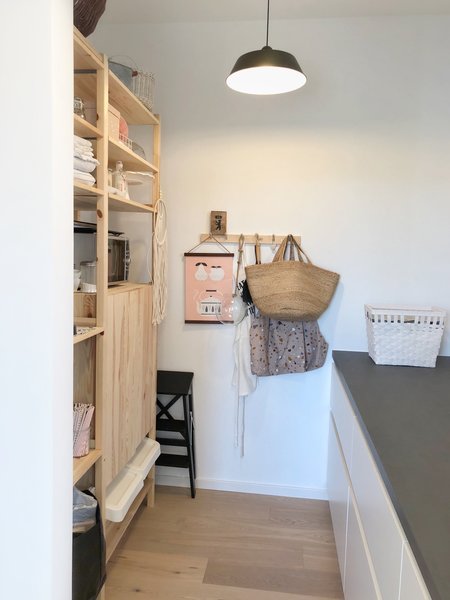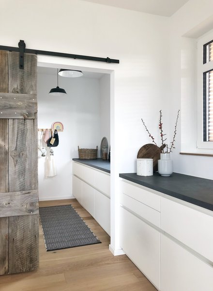 Wie eine Verlängerung der Küche wirkt die hübsche Speisekammer von @simplylifeandme , die sie ihren liebsten Raum nennt. An der gegenüberliegenden Wand sorgen Holzregale für Stauraum. Durch die tolle Scheunenschiebetür geht außerdem kein Platz verloren.