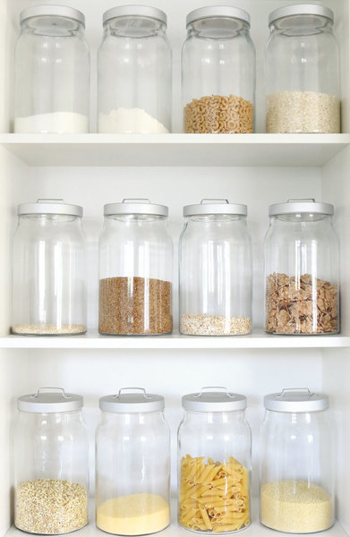 Dekorative Lebensmittelkisten, Körbe oder durchsichtige Gläser sehen im Schrank besonders schön aus und können mit kleinen Schildern einheitlich beschriftet werden. Dabei sollte man unbedingt auch das Haltbarkeitsdatum des Produktes notieren – so gerät es nicht in Vergessenheit!