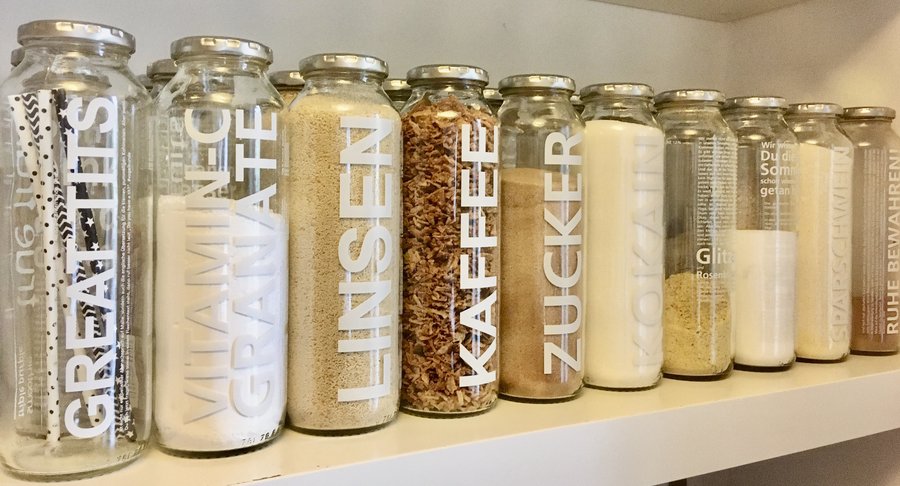 Upcyclingtipp: Es sind keine einheitlichen Vorratsgläser zur Hand? Gar kein Problem! Für die Speisekammer können auch alte Marmeladengläser oder Smoothieflaschen aus Glas wiederverwendet werden. Einfach gründlich sauber machen, neu befüllen, Deckel und Etikett drauf – fertig!