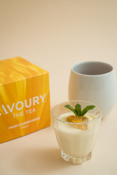 Zur Pannacotta mit Hollergelee gab es einen Fresh Elderflower, einen milden Holundertee: Die fruchtig-leichte Kombination aus Ringelblume, Holunderblüte und einer spritzigen Note von Zitronenschale bildete hier das optimale Pendant zum Holundergelee. (rechtes Bild: @oversea_design )