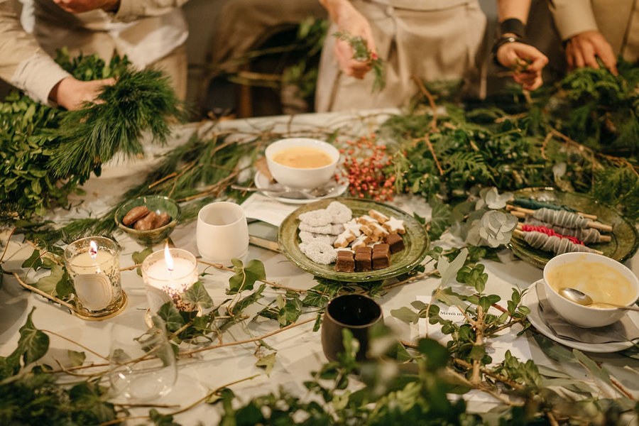 Zwischen ausgelöffelten Schalen mit Kürbissuppe und entstehenden Adventskränzen. Zu einem rundum sinnlichen Erlebnis gehört unbedingt auch ein duftender Raum: Danke an Diptyque für die Düfte Sapin und Flocon sowie für das Goodie an alle Teilnehmer. Ebenso in den Goodiebags: handgefertigte Teetassen von Avoury, AD Magazine und mit Namensgravur versehene Notizbücher von Leuchtturm1917.