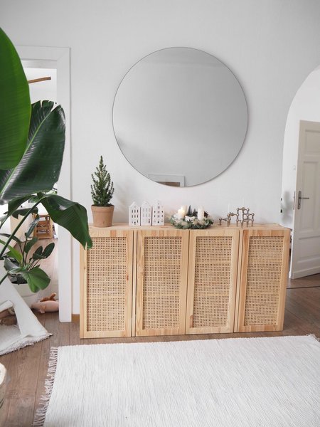 Vorher und nachher ein Hingucker: @aboutperri hat die Türen ihrer IVAR-Schränke mit Wiener Geflecht verkleidet und ihnen anschließend noch einen weißen Anstrich verpasst. So wirkt das neue Sideboard noch luftiger und fügt sich perfekt in ihr hell und natürlich gehaltenes Wohnzimmer ein.