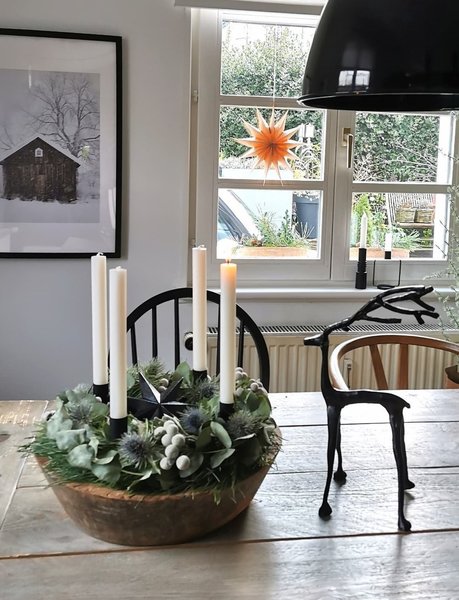 Bei @veruschka treffen grüne Kiefernzweige auf rauen Beton. Der Kerzenhalter von House Doctor kann sich auch außerhalb der Adventszeit sehen lassen. @art_gerechtwohnen fällt die Entscheidung für einen Adventskranz schwer. Sie stellt daher jeden Tag einen anderen auf den Tisch. Dieses Mal macht der Circle-Kerzenhalter von ferm LIVING das Rennen, den es übrigens auch in Schwarz gibt.