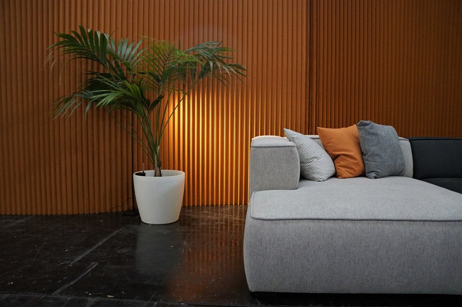 Gekonnt inszeniert: Der Lamellenwand in Orange sowie der Zimmerpflanze können ein gewisser Retro-Chic nicht abgesprochen werden – wir sind begeistert von der Kombi mit dem klar geschnittenen Sofa. (Halle A2 / Stand 264)