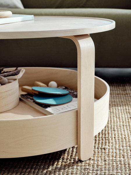 Dezentes Statement: Durch seine weichen Kanten verschmilzt der BORGEBY-Couchtisch aus Birkenholz sanft mit der Umgebung. In der unteren Ebene können Bücher, Zeitschriften oder andere kleine Dinge verstaut werden.