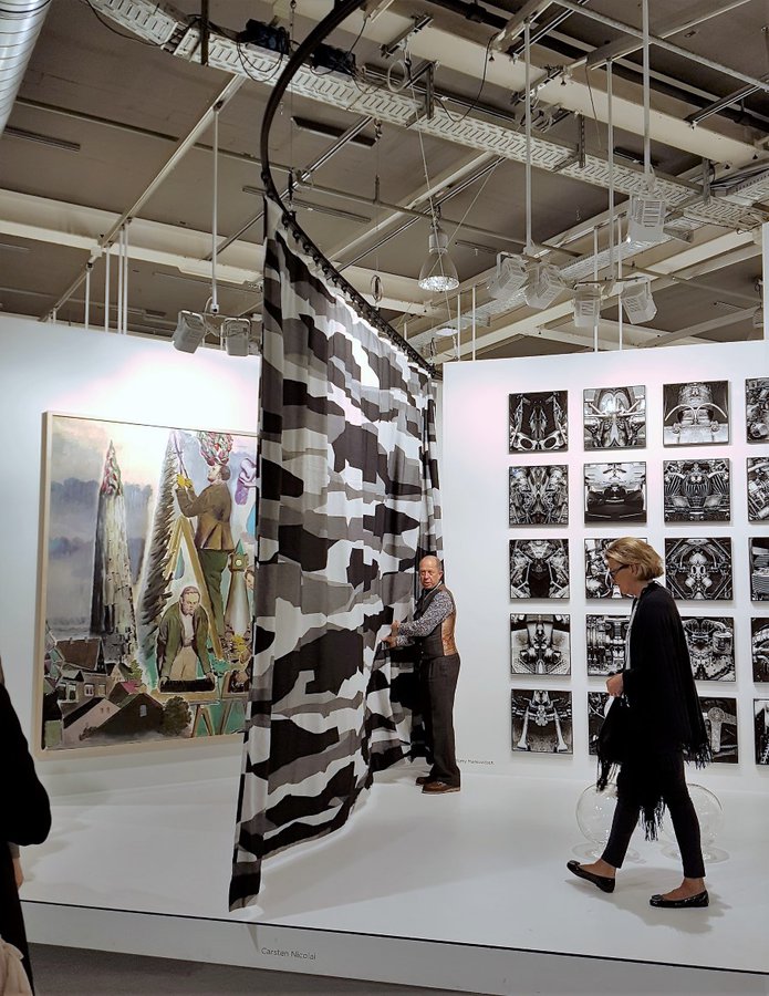 Auch die Hängungen, Formate oder Rahmung finde ich immer wieder spannend, wie beispielsweise bei der Galerie Taka Ishii aus Tokyo, davor steht die Skulptur „Two identical child chairs“ von Yuki Kimura. Die Pariser Galerie Kamel Mennour hatte ein Kunstwerk des beeindruckenden Tadashi Kawamata ausgestellt, eines japanischen Bildhauers und Fotografen, der in Tokio und Paris lebt und arbeitet – für ihn ein untypisch kleines Format, da er vor allem für seine großen Installationen aus Holzbrettern bekannt ist, die er in der Umgebung der Kunststätte findet und in denen er sich auf die Behausungen Obdachloser bezieht.