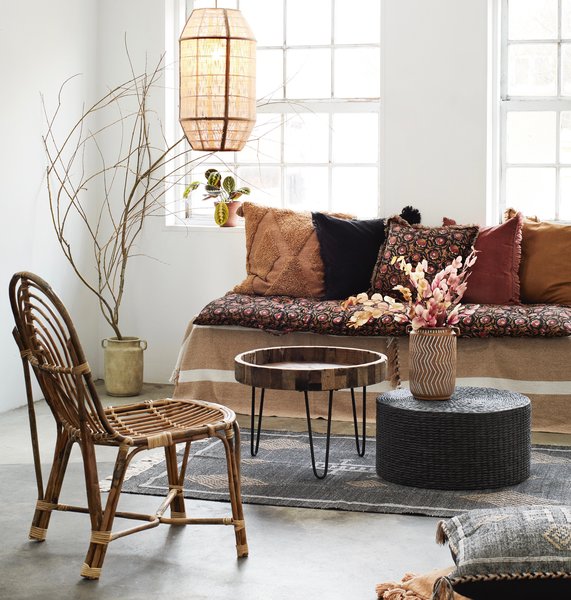 Wie ein Naturabenteuer in den eigenen vier Wänden: Bei Madam Stoltz vermischen sich Möbel aus Bambus und Holz mit ungeschliffenen Terrakottavasen. Für Wohlfühlatmosphäre sorgen Textilien in warmen Farben und floralen Mustern sowie sanft strahlende Papierleuchten.