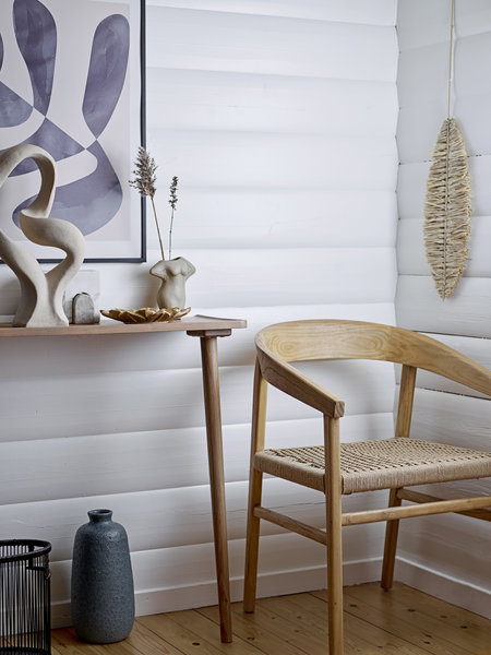 Der Knitting Chair von Ib Kofod-Larsen ist 1951 erstmals in limitierter Auflage erschienen und kehrt nun bei MENU in die moderne dänische Designlandschaft zurück. Er vereint perfekte Proportionen mit hoher Qualität. Madam Stoltz schafft mit Holz- und Rattanelementen sowie einer charmanten Naturdeko ein rundum herbstliches Arrangement.