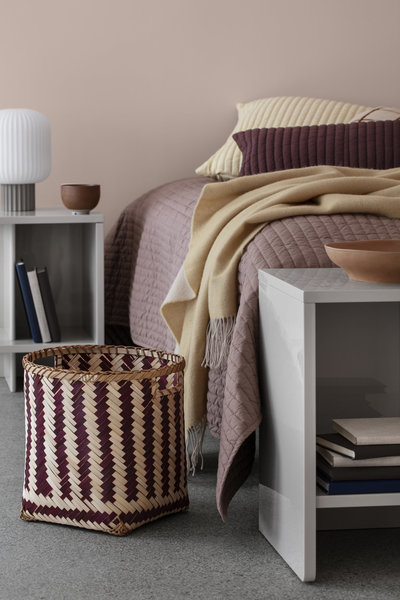 Zarte Puder- und kräftige Beerentöne gibt es bei Broste Copenhagen: Der gemusterte Bambuskorb Meli und die Terrakottaschale Shape sorgen für schicken Stauraum, gemütliche Textilien und die Opalglasleuchte für sanfte Wohlfühlstimmung. Bloomingvilles Vitus Dining Chair wird von organisch geformter Deko stimmig akzentuiert.