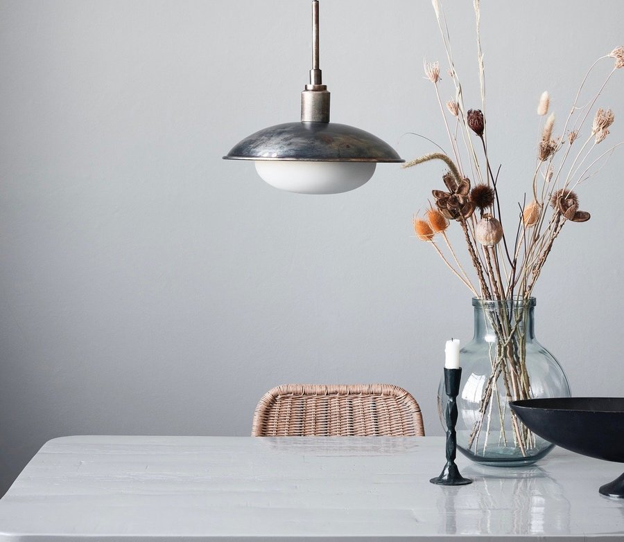 Zeitlos schön: Die Pendelleuchte Boston von House Doctor sorgt für trendigen Industrielook im herbstlichen Zuhause. Die schwarzen Accessoires aus Eisen sowie die Glasvase Aran unterstreichen den rauen, aber eleganten Stil.