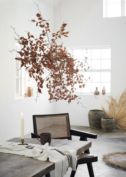 Der Rosen Lounge Chair von Bloomingville kombiniert weiche Formen mit dem Trendmaterial Rattan. Bei Madam Stoltz fügen sich Steingutvasen und Terrakottatöpfe im Ethnolook zu einem herbstlichen Ensemble. Die Bambustischleuchte zaubert eine atmosphärische Lichtstimmung.